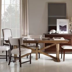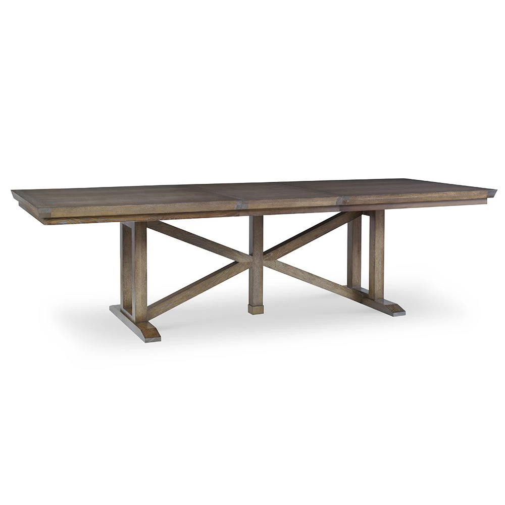 Rectangular oak trestle dining table with one 24″ leaf (Opens to 109″). Available in a range of finishes.