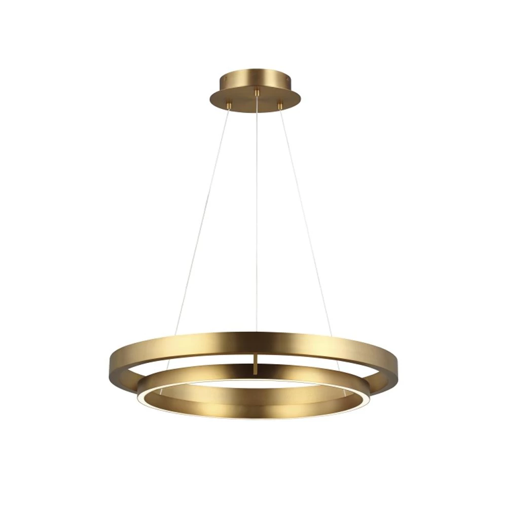 Suspended metal ring chandelier with integrated LED lamp. Hangs from 12″ to 149″ (144″ of cable) and includes 8″ dia. canopy. Available in Aged Brass or Matte Black/Weathered Oak Wood.