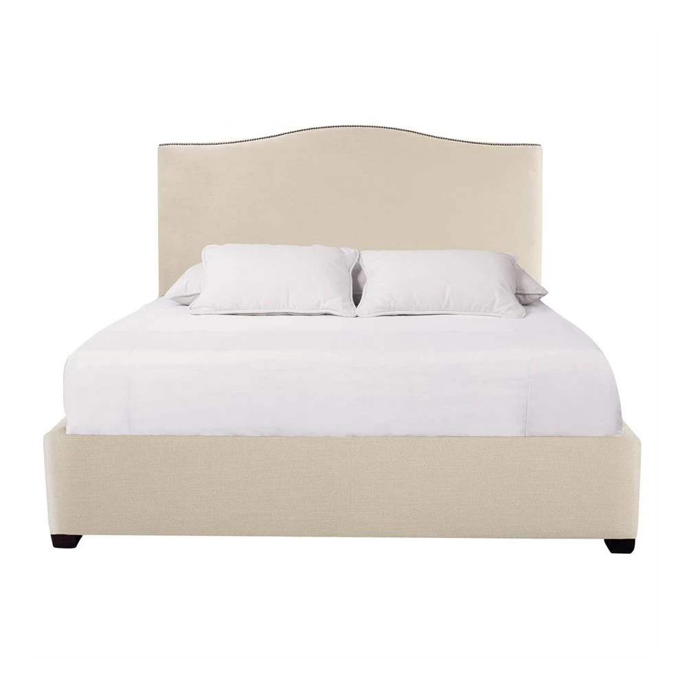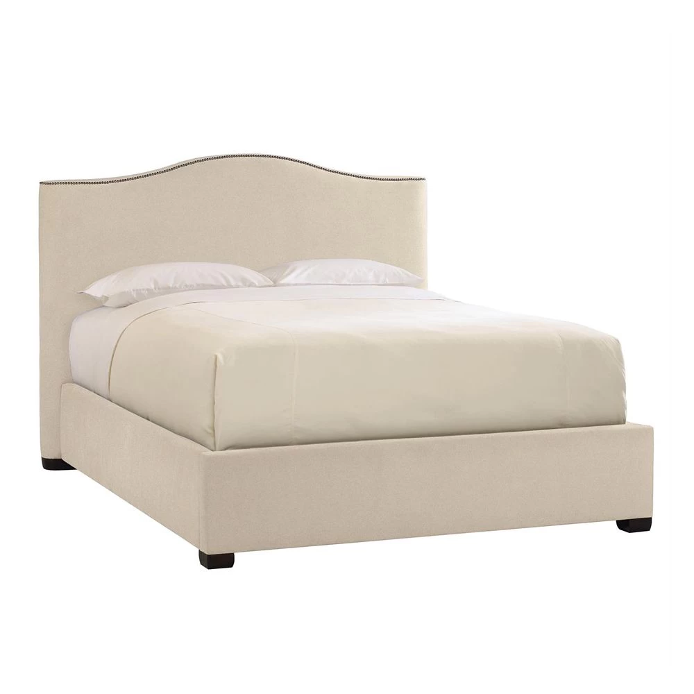 Upholstered King panel bed with 54h headboard, nailhead trim, Espresso finished legs and slat mattress support.