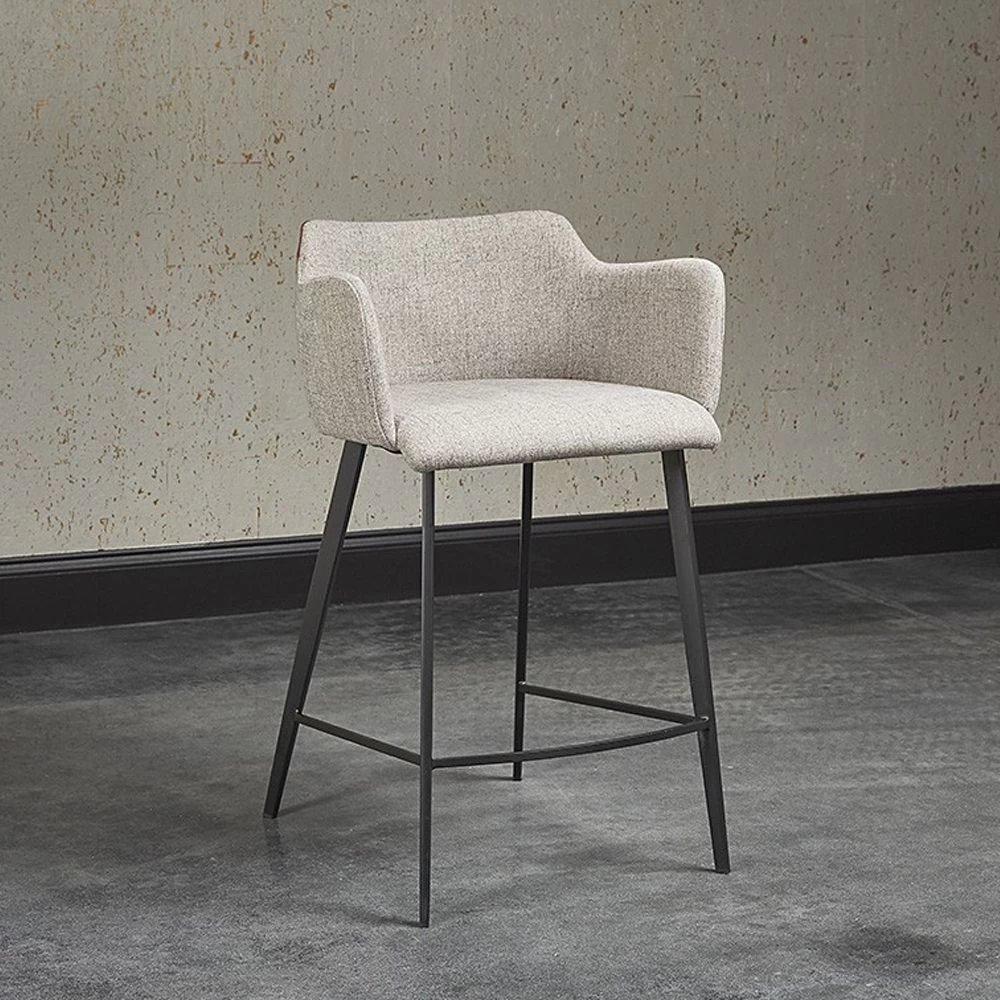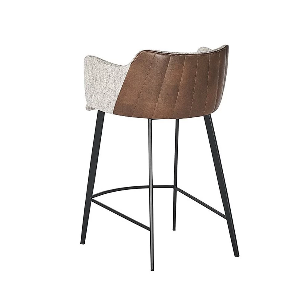 Upholstered counter stool in combination of November Grey fabric and Bravo Cognac leather on a black iron frame.