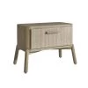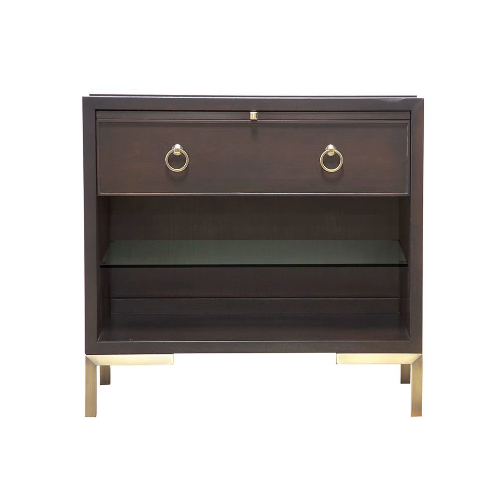 Single drawer nightstand with bead line outline on drawer front, Satin Brass metal legs, small ring pull hardware, glass shelf. and pull-out tray shelf.