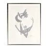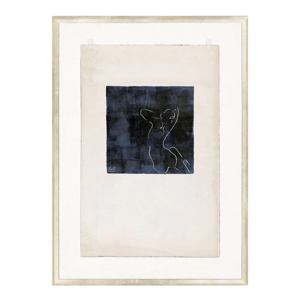 Delicate figurative drawings executed on dark indigo ink rolled surface in a warm silver wood frame.