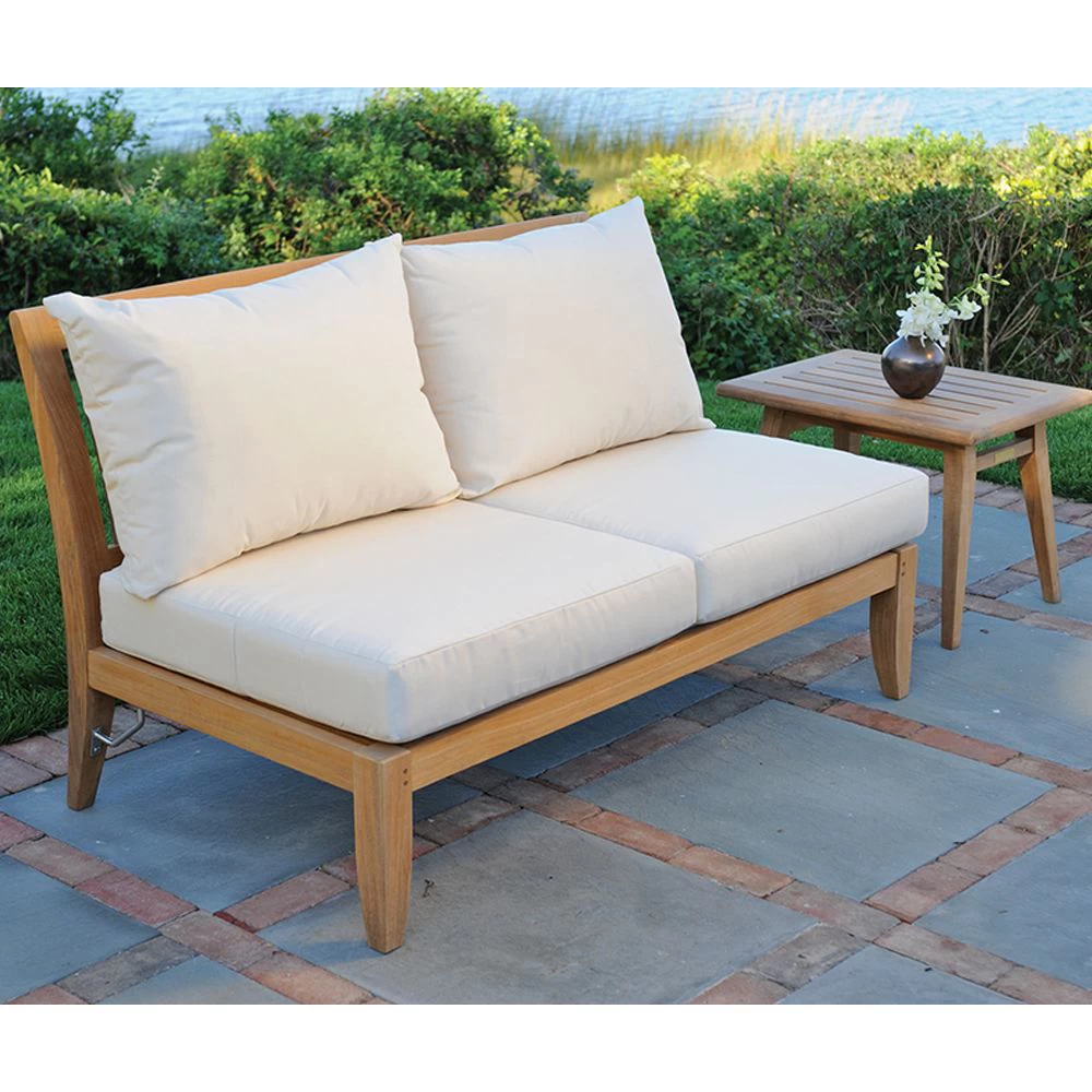 Outdoor teak sectional Armless Settee with Stainless Steel accents and outdoor rated cushions and fabrics. Available in a range of Sunbrella fabrics.