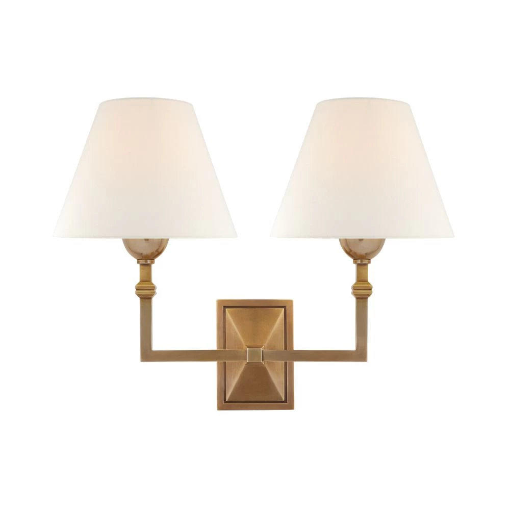 Alexa Hampton design double wall sconce in Hand-Rubbed Antique Brass with a linen shade. Also available in Antique Nickel, Polished Nickel, and Gun Metal finishes. Backplate is 3.25″ x 4.75″ Rectangle.