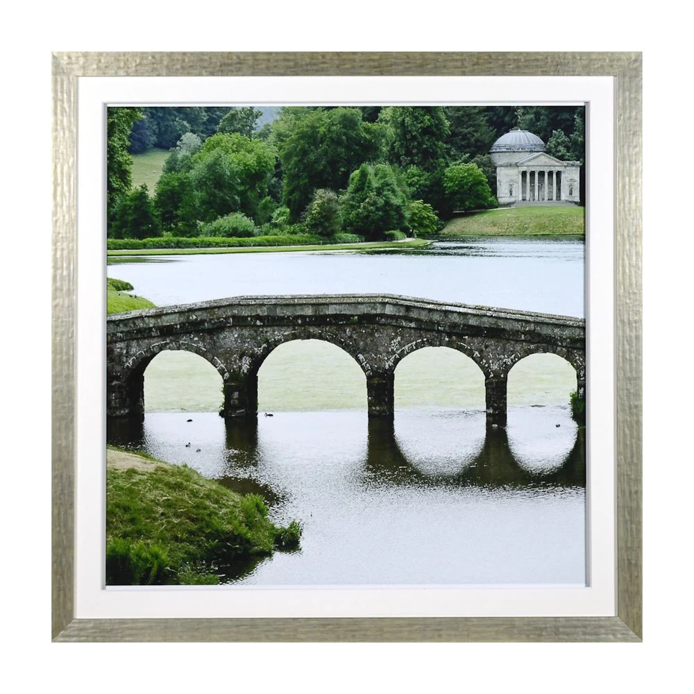 A rich green formal garden photograph in a silver dappled wood frame and double height white matte. Available in two sizes (19×19, 34.25×34.25) or custom sizes.