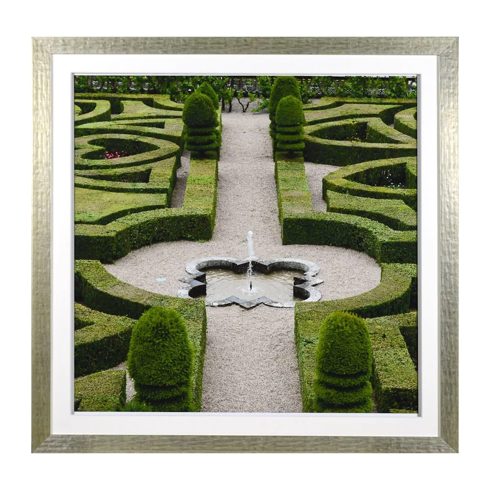 A rich green formal garden photograph in a silver dappled wood frame and double height white matte. Available in two sizes (19×19, 34.25×34.25) or custom sizes.