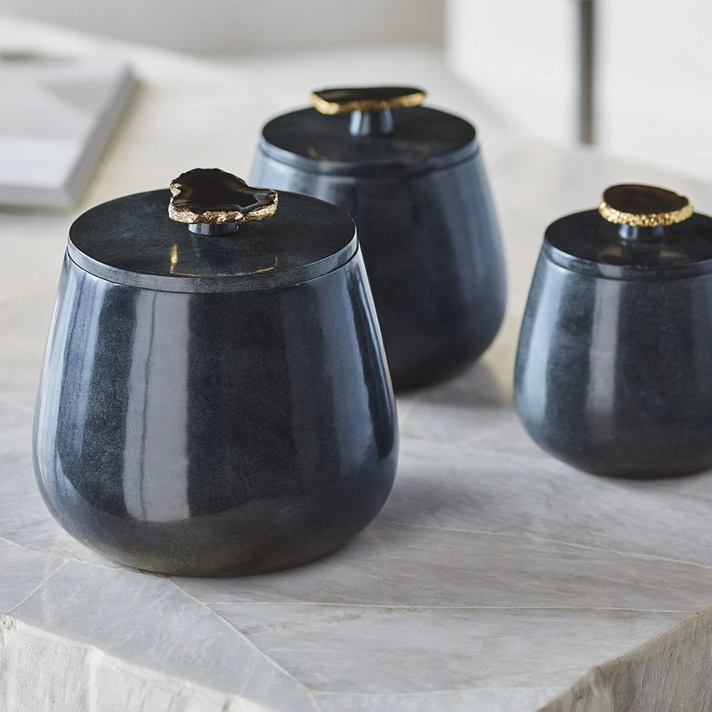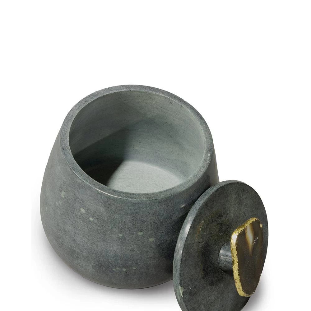 Natural soapstone box in a grey blue finish featuring a lift off lid accented with a natural agate stone handle with gold trim. Soapstone and handle are natural materials and may vary in color, grain and size.