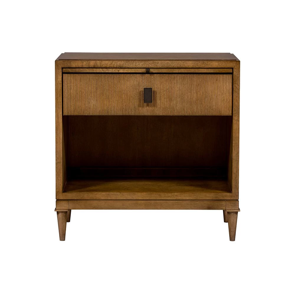 Single drawer nightstand with reeded drawer fronts, turned legs, Antique Bronze pull hardware, and pull-out tray shelf.