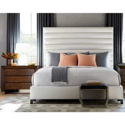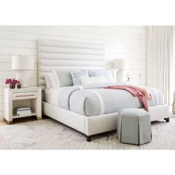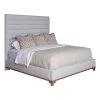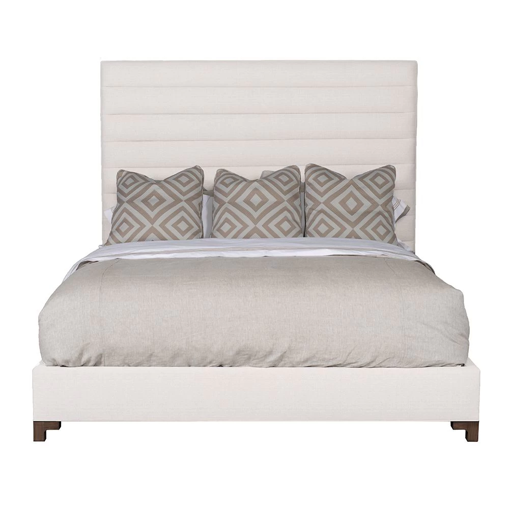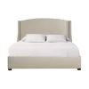Upholstered King bed with upholstered rails and legs and slat mattress support.