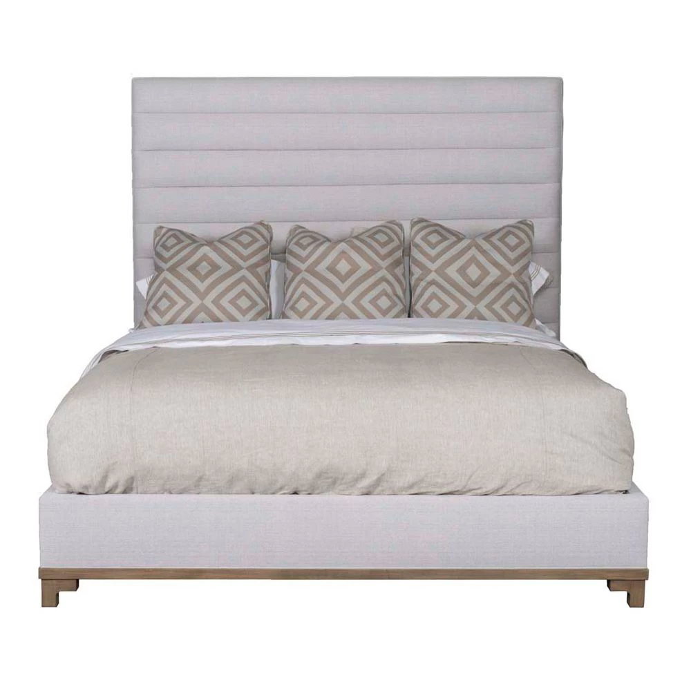 Upholstered and channeled platform queen bed with bracked wood leg. Available in King, Queen and Full sizes. Shown is the king size with three extra optional pillows. Showroom model is in Jenner Moodust (153015) fabric (gr.12), 56h headboard and wood base in Durango Gray.