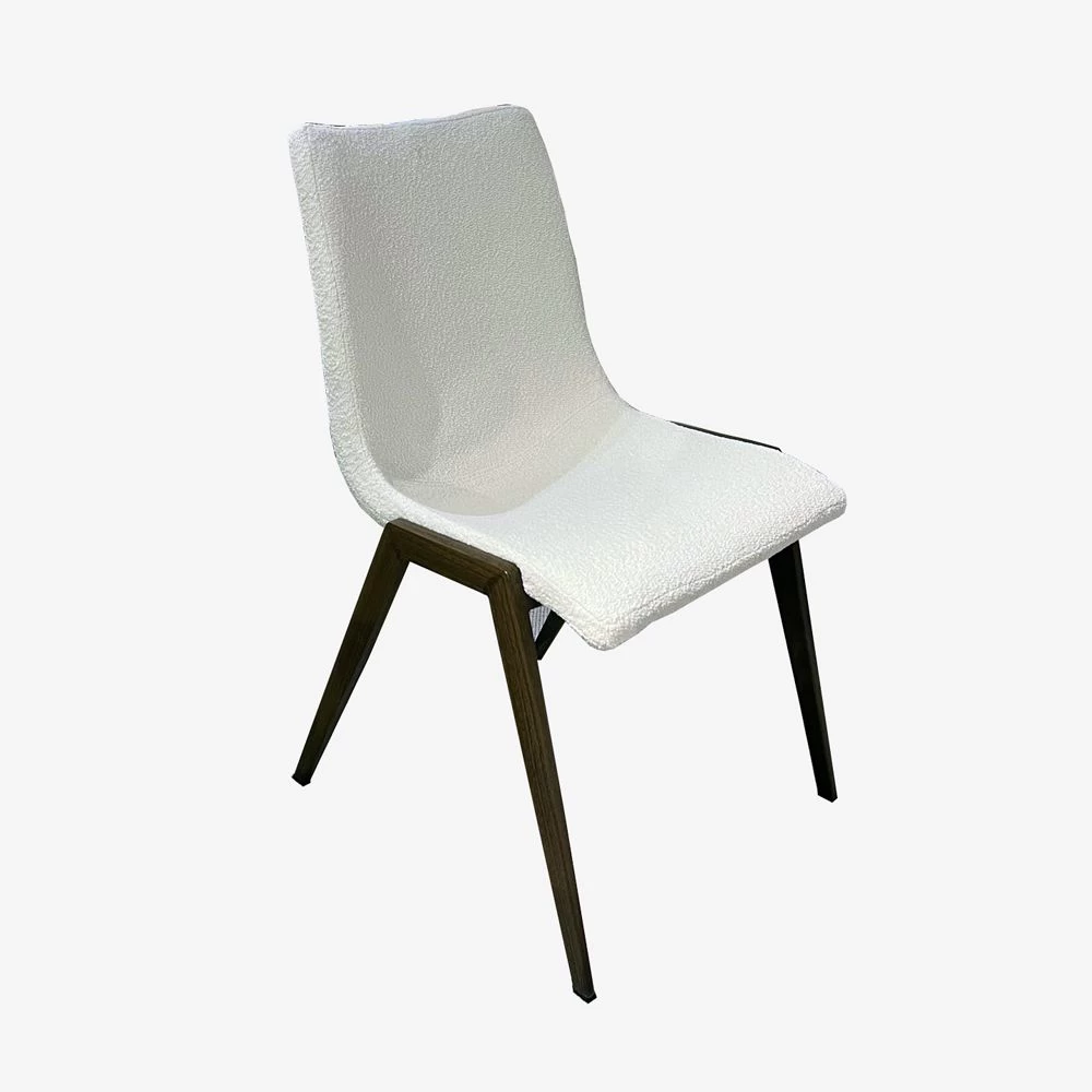 Smoked Walnut finished metal dining chair with upholstered seat in White fabric (Gladys 010). Also available in Black metal frame and in other faux leathers and fabrics.