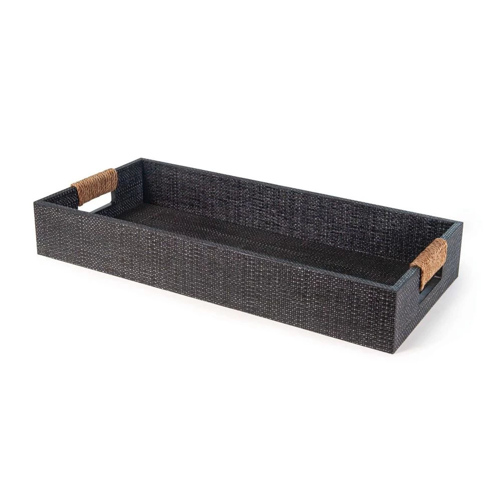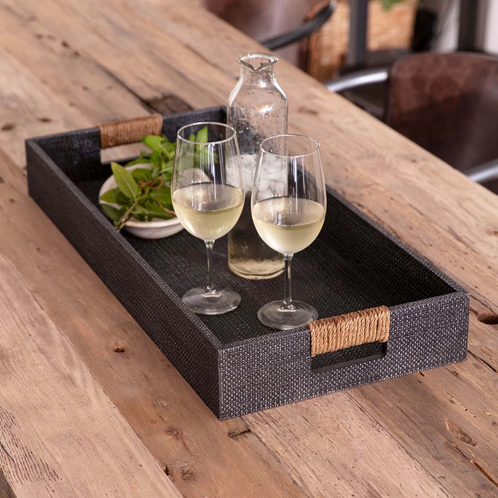 Textured fabric covered tray with natural rope wrapped handles. Available in larger size and in Indigo and White colours.