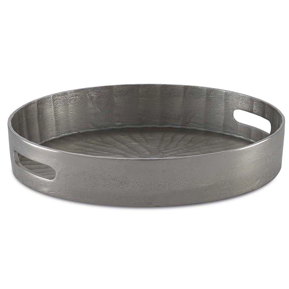 Cast aluminum tray with a scored textural interior and silver finish.