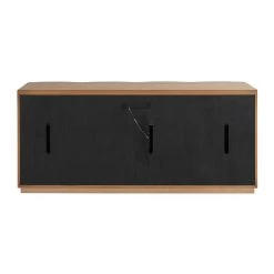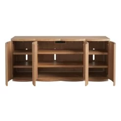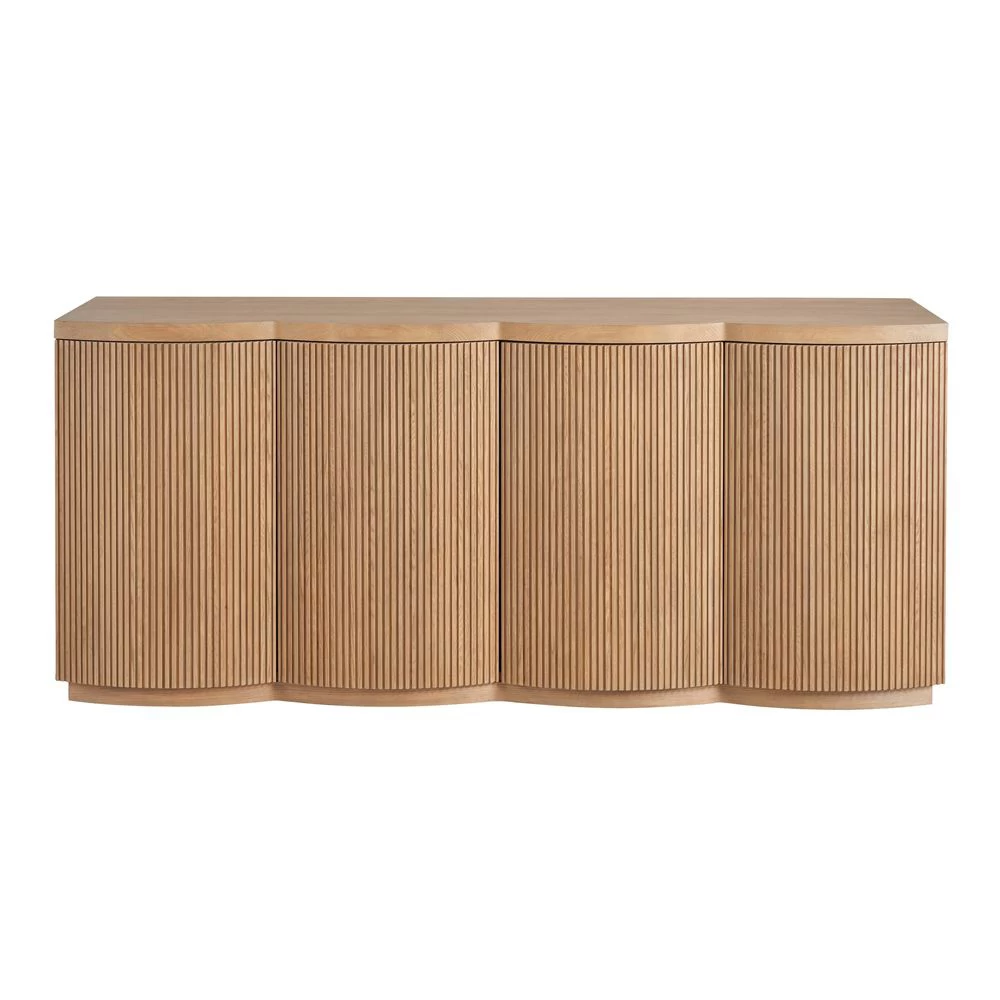 New Modern collection 4-door reeded cabinet finished in Natural Oak with 6 adjustable shelves and a power bar in the back of the cabinet.