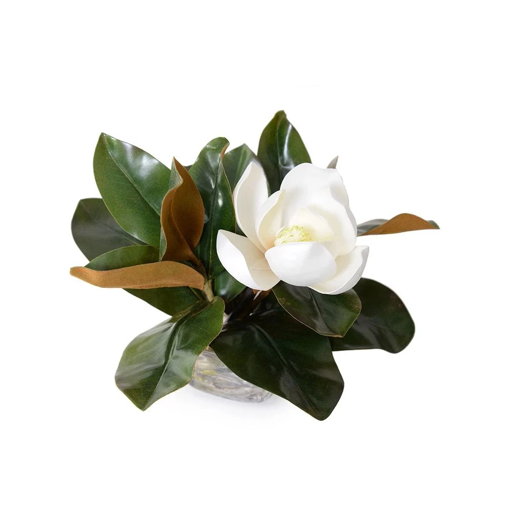 Magnolia foliage and White blossom arrangement in a 3″ clear cube. Indoor use only.