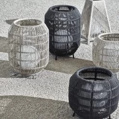 Table lamp in powder coated metal frame hand-woven with charcoal color all-weather synthetic wicker. Lamp comes with an average 15′ cord. Suitable for outdoor use in a wet location.