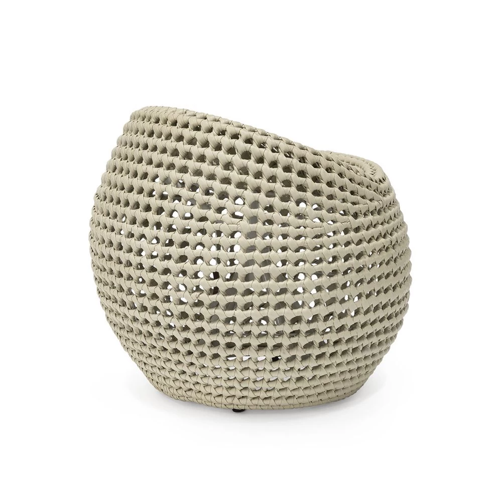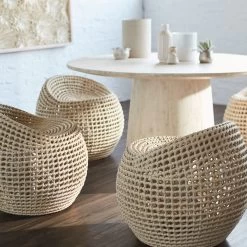 Round Ivory woven vinyl swivel dining stool supported by a metal frame.
