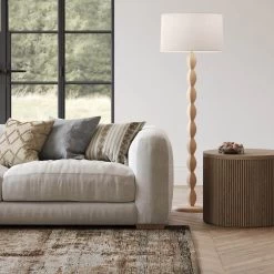 Natural wood finished floor lamp with Off-White linen drum shade.