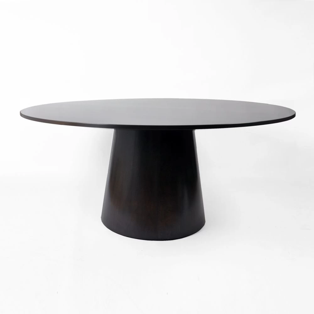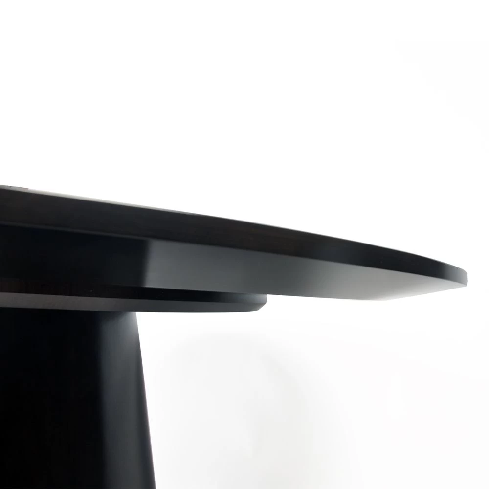 Modern design round pedestal dining table in solid Maple with beveled underside in a Graphite finish. Customizable from 36″ to 72″ diameter and available in a range of custom wood types, stains and paint finishes.
