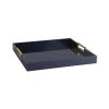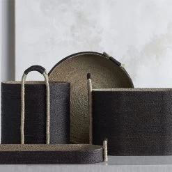 Double wall round tray features hand-woven natural seagrass on inside and black-grey dyed seagrass on the outside with a hard coat glaze to hold its shape accented with large contrasting handles.
