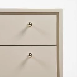 2 drawer nightstand with extended tapered legs. Finished in BM OC-22 Calm painted cabinet and Black Ice painted base and Globe knobs in Polished Nickel (GLK-PN).