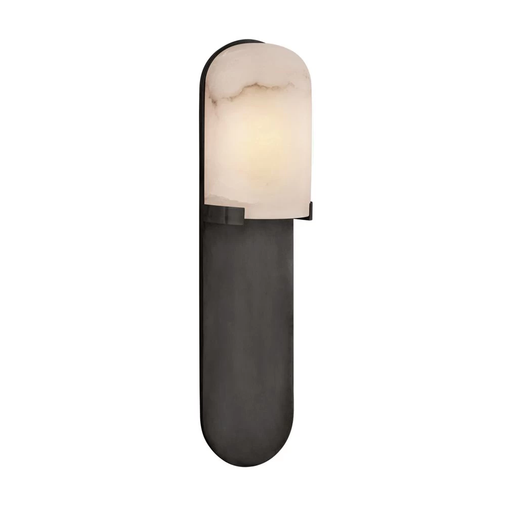 Kelly Wearstler design metal pill-shaped sconce in Bronze with Alabaster shade. Available in Antique Burnished Brass, Polished Nickel and Bronze finishes. Sconce has 4×18.25 wall backplate.