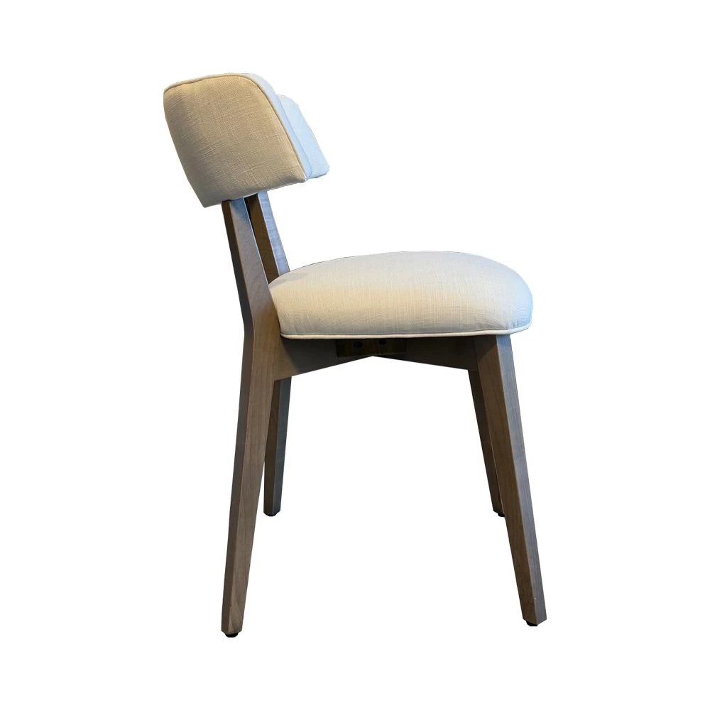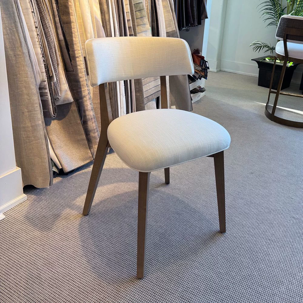 Curved back dining side chair with Maple wood legs. Priced with 1.5 yd of mid-level fabric.