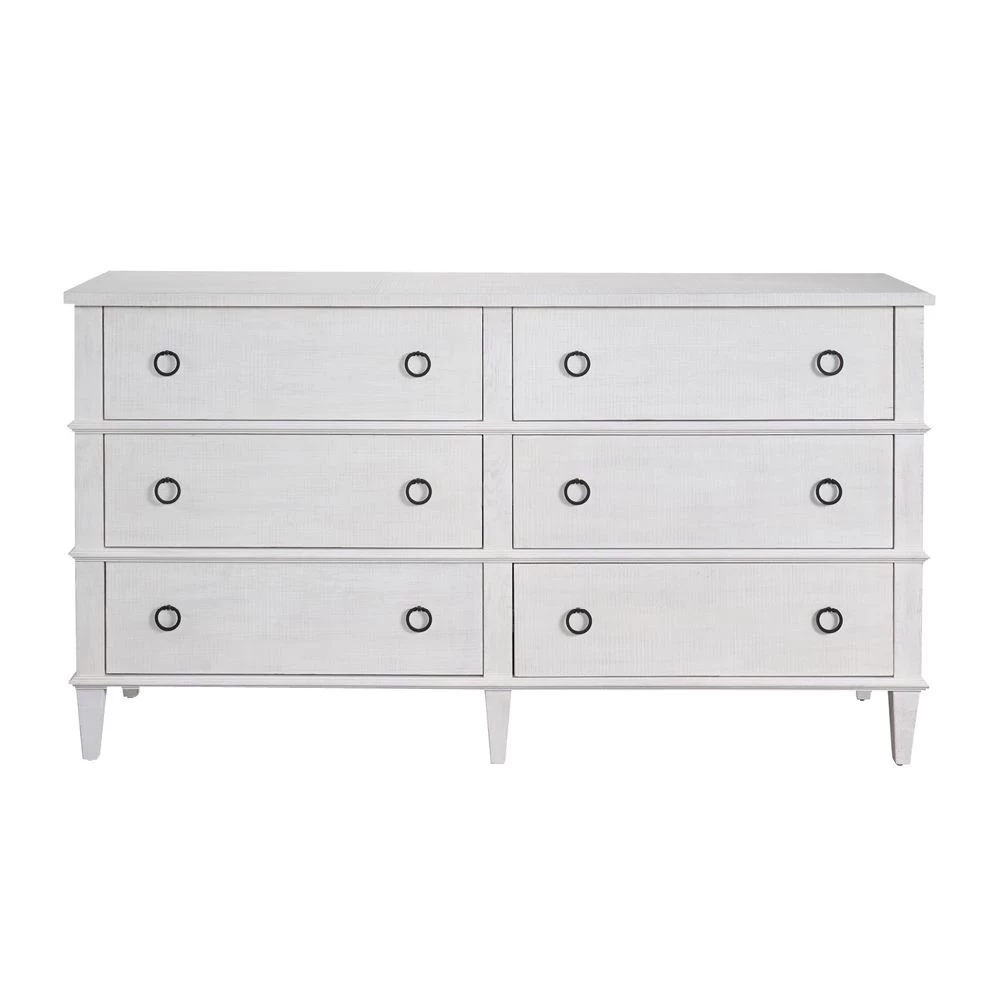 Modern Farmhouse collection six drawer dresser finished in Rustic Oak and with Black finished ring pulls.