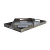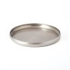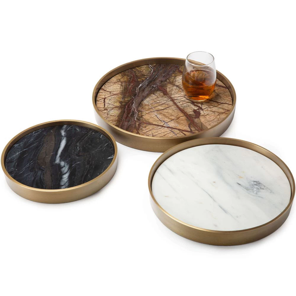 Natural Brass finished round aluminum trays with black, white and brown stone insets.