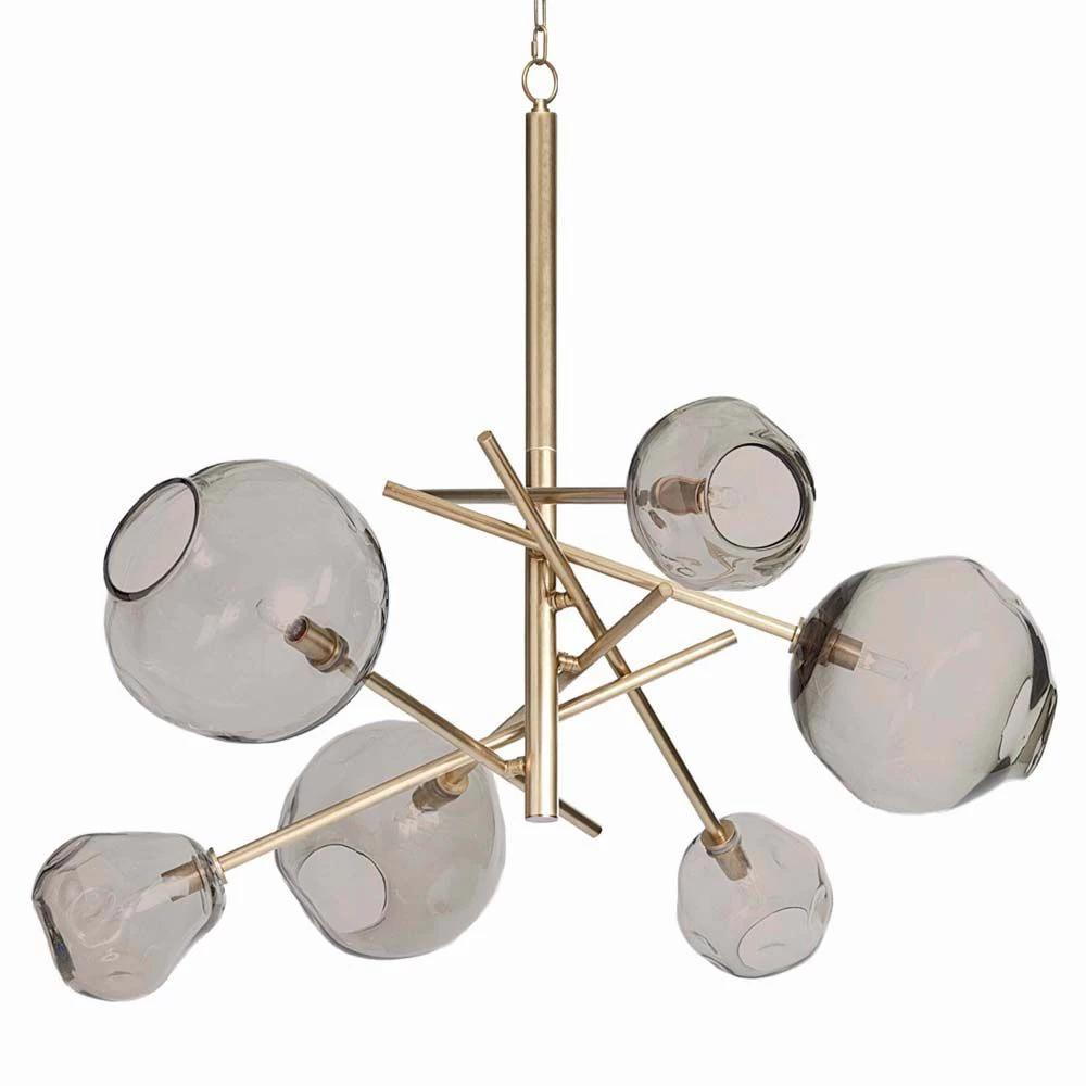 Natural Brass finished 6-light chandelier with smoke glass shades.
