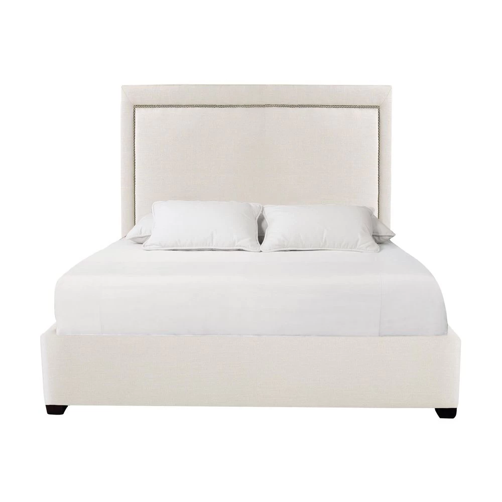 Picture frame fully upholstered Queen bed with nailhead trim.