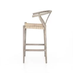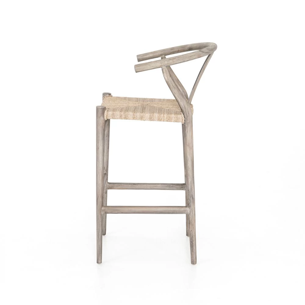 Classic wishbone-style counter stool with Vintage White all-weather wicker and Weathered Grey stained teak frame. Available in barstool and dining chair heights and in Black stain.