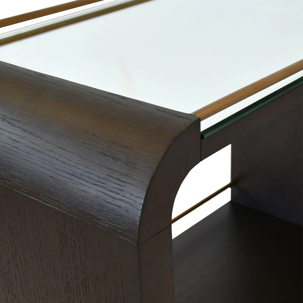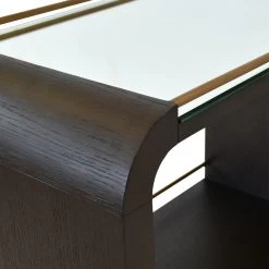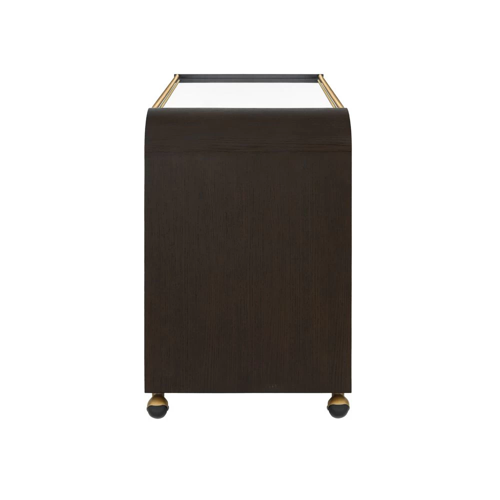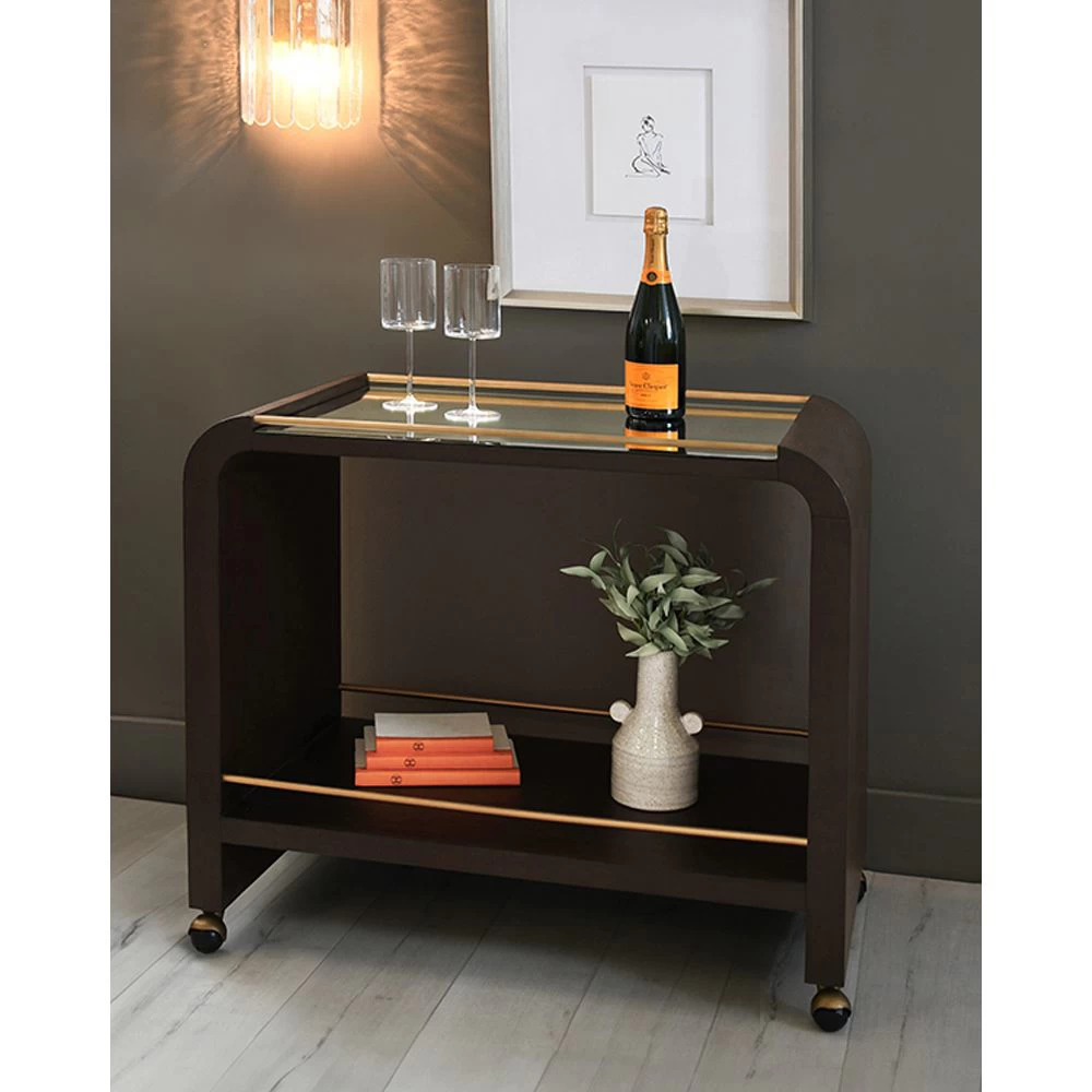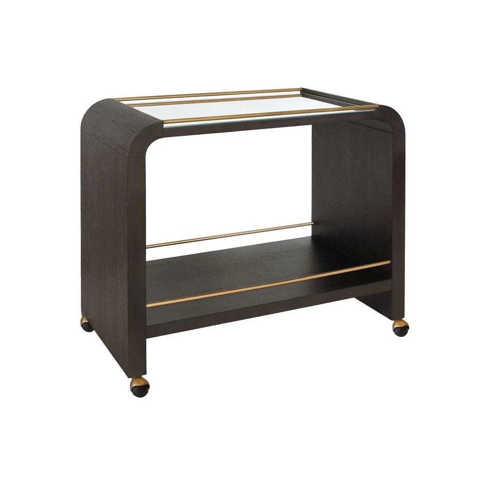 Waterfall styled oak bar cart in Espresso Black finish with brass accents and clear mirror tray surface. Also available in Natural Oak finish.