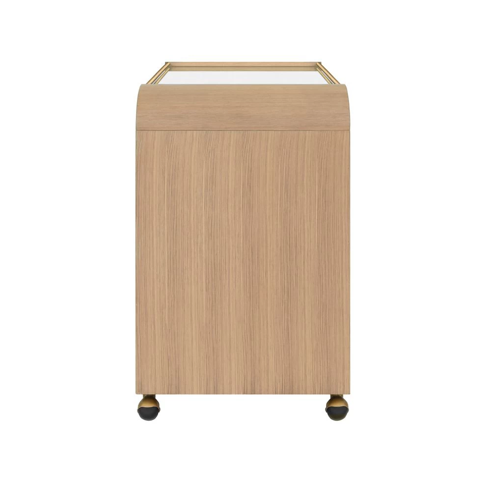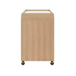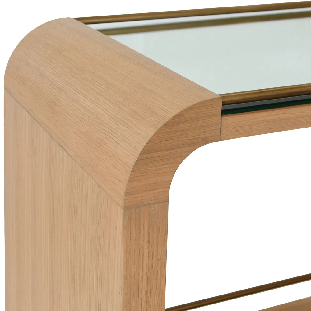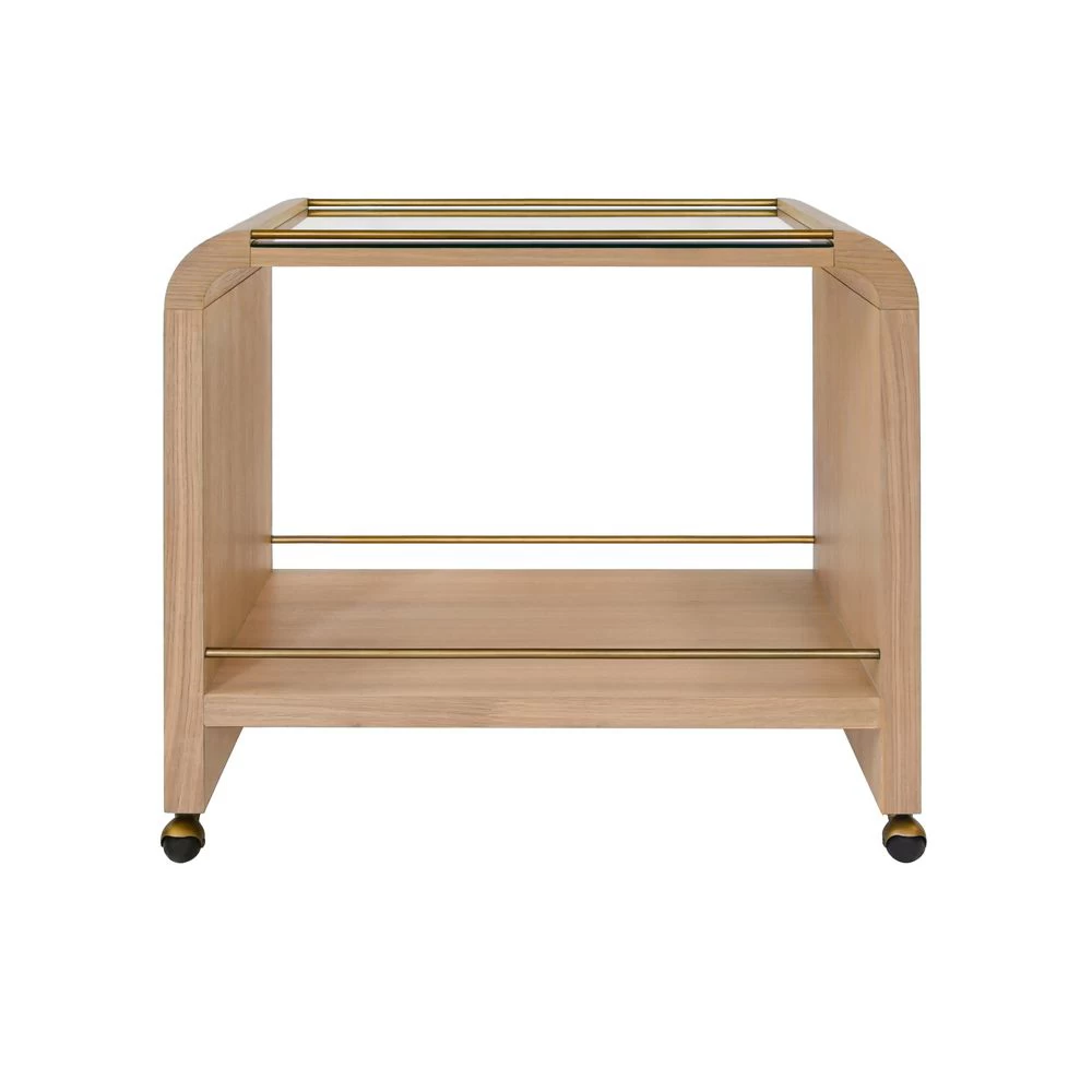 Waterfall styled oak bar cart in Natural Oak finish with brass accents and clear mirror tray surface. Also available in Espresso Black finish.
