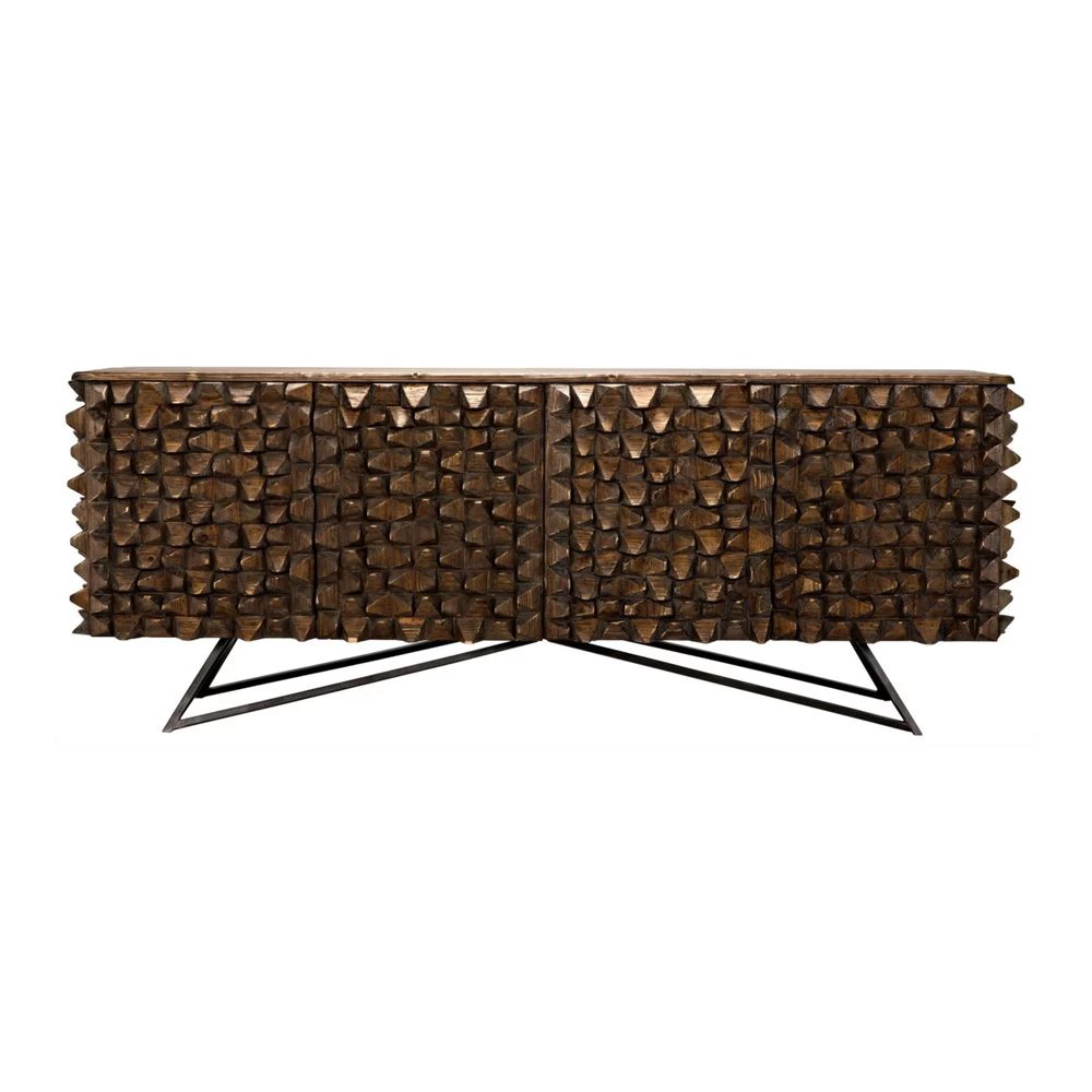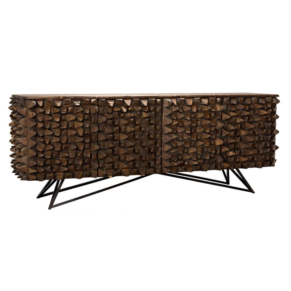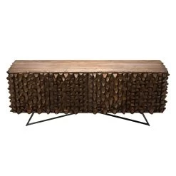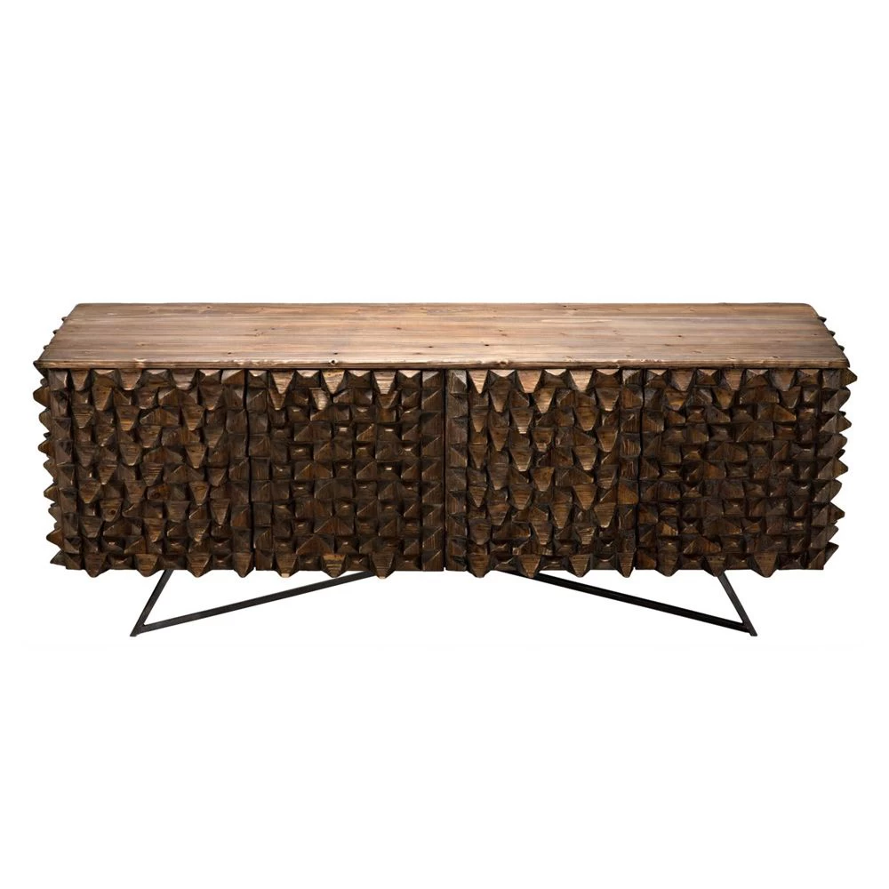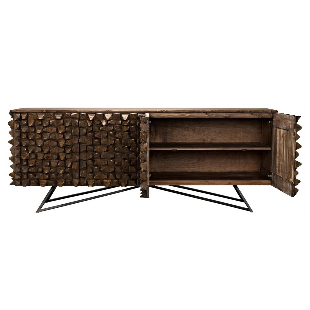 Old Wood finished fir cabinet with 4 doors and a shelf behind each pair of doors. Supported by a contemporary Blackened iron base.