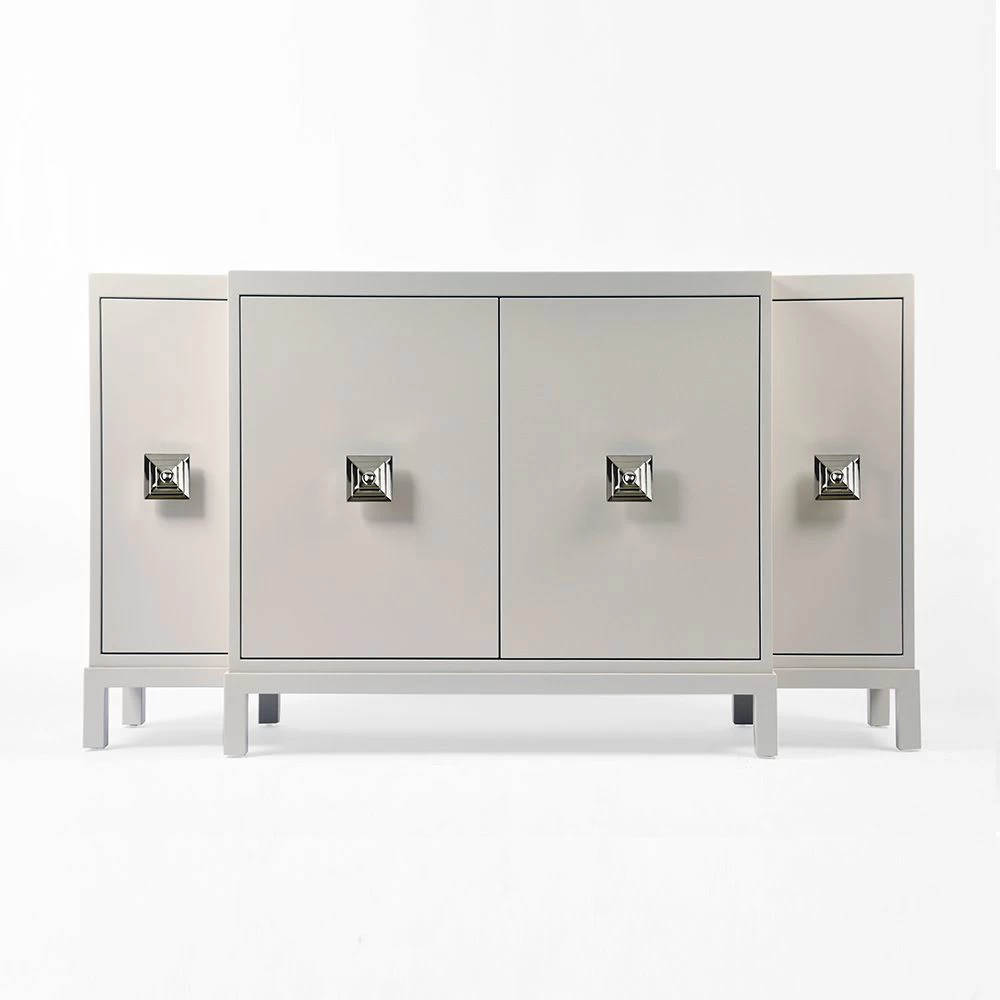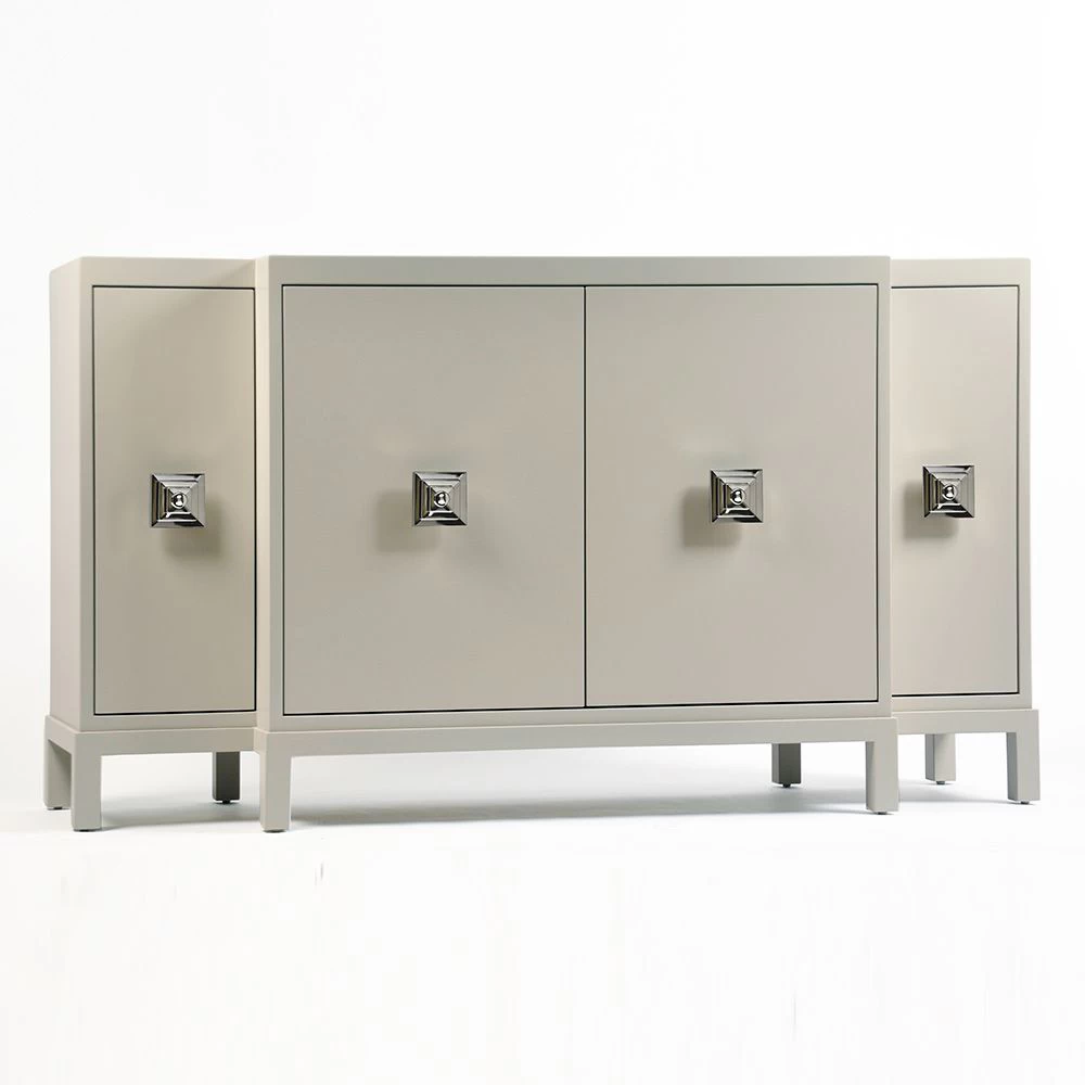 4 door custom breakfront buffet with 3 compartments and 3 adjustable shelves in BM Revere Pewter finish and Square Nickel pulls (CYPN).