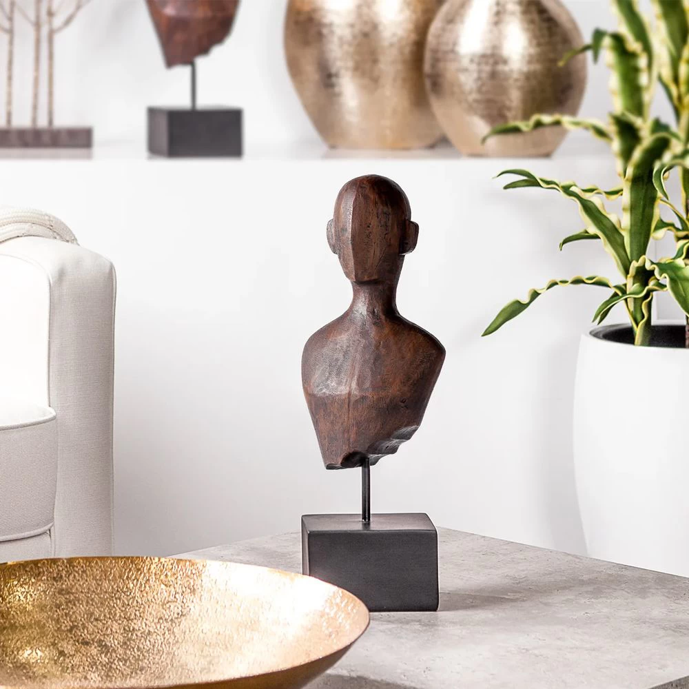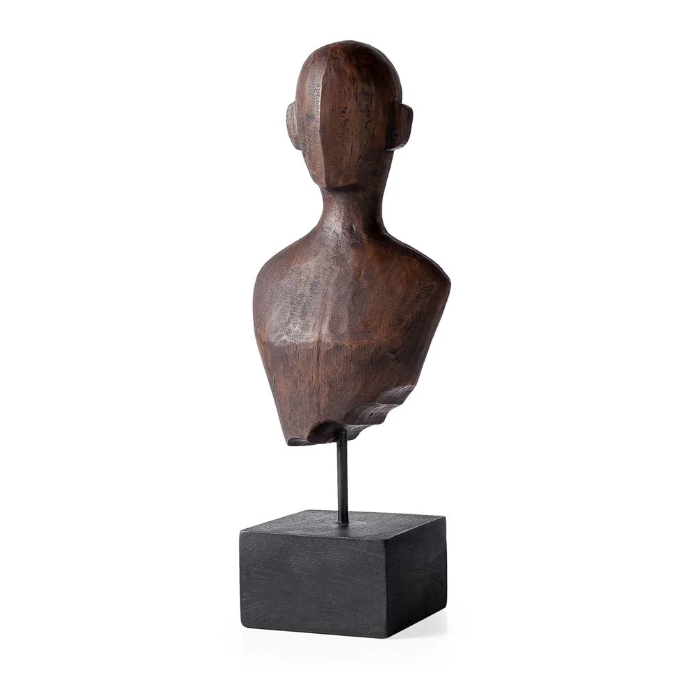 Brown patina sculpture on a stand.