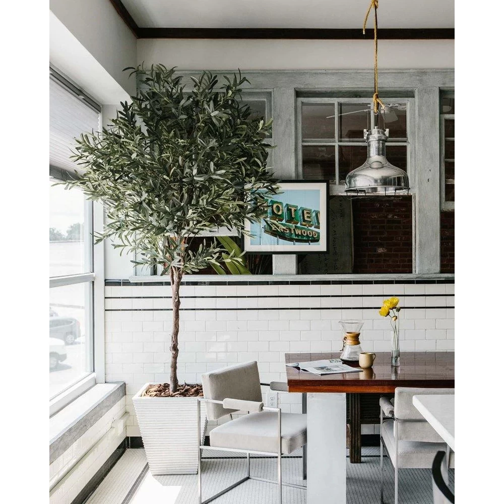The 8′ faux olive tree has slender, silvery gray-green leaves on a realistic artificial trunk. 13″ dia. mache nusery pot. Indoor use only.