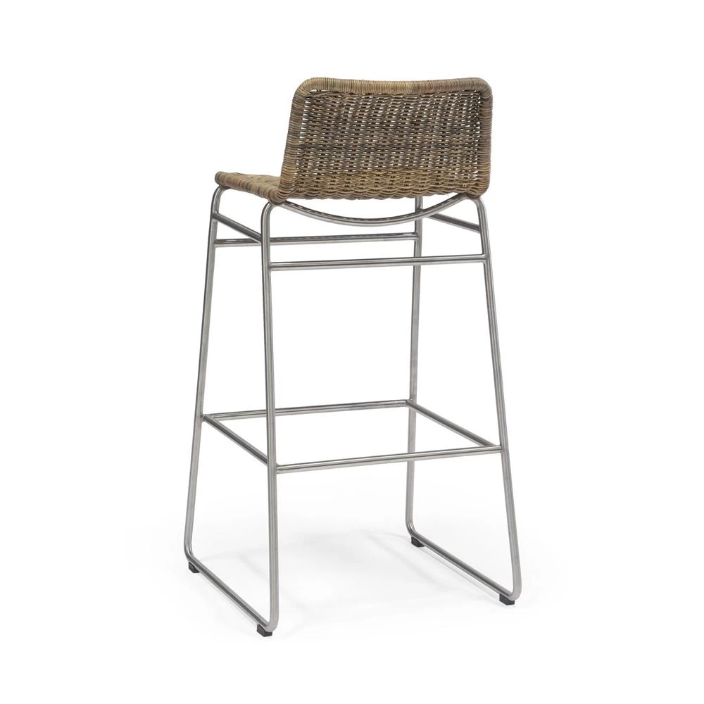 Counter Stool in hardwood frame and legs in a warm brown tone accented with an antique brass finish footrest with a double wall back of woven synthetic rattan peel in a honey finish. Stools come with a fixed upholstered seat. (Discontinued product).
