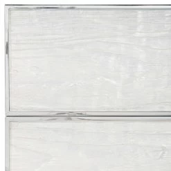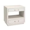 Two drawer nightstand with High Sheen White Lacquer cabinet finish, Stainless Steel frame around drawers and base, and inset faux wood-grained patterned acrylic drawer fronts and Silver Leaf backs.