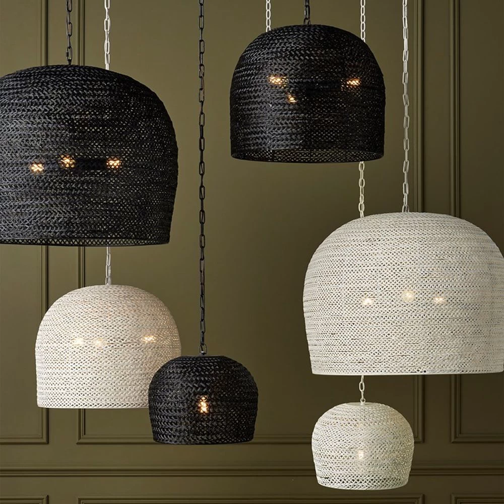 Round white iron hanging shade chandelier. 6′ of white chain included. Available in larger and smaller sizes and in Black finish.