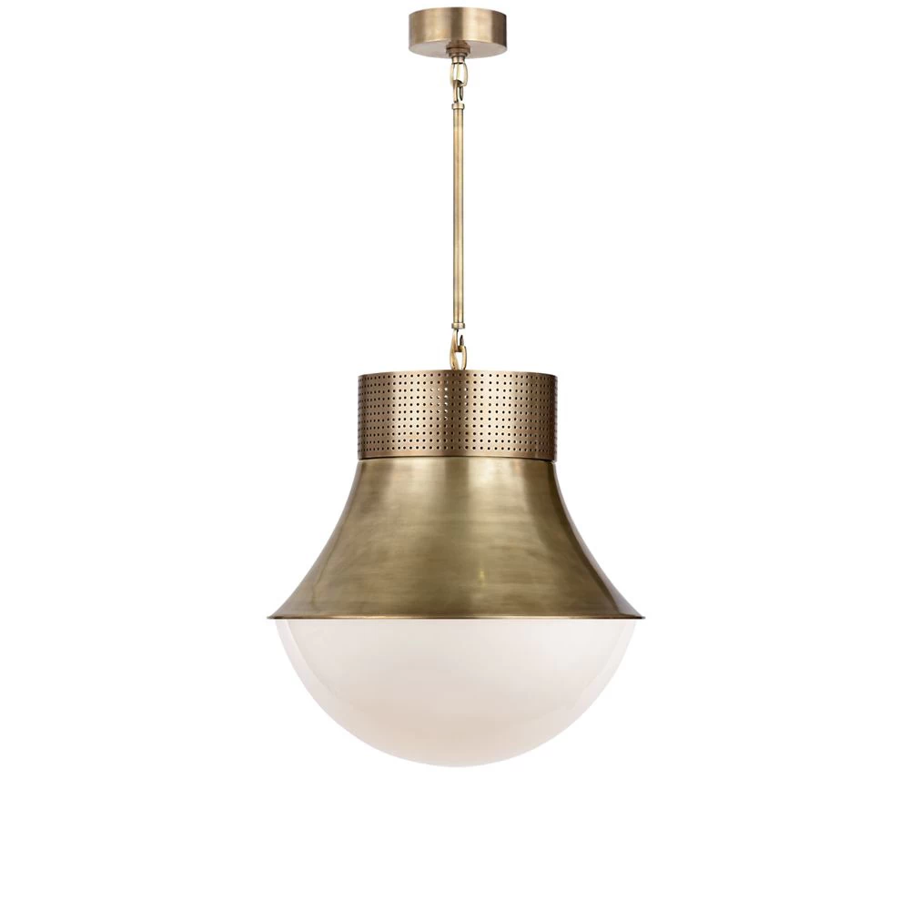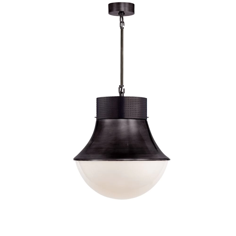 Kelly Werstler design metal and white glass pendant. Available in Polished Nickel, Bronze or Antique Burnished Brass finishes. Minimum custom height of 27h.