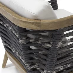 Teak wood frame lounge chair in a natural golden brown finish, accented with wrapped marine grade synthetic rope in a dark charcoal grey design with maximum UV protection. Chair comes with a loose seat and back cushions.