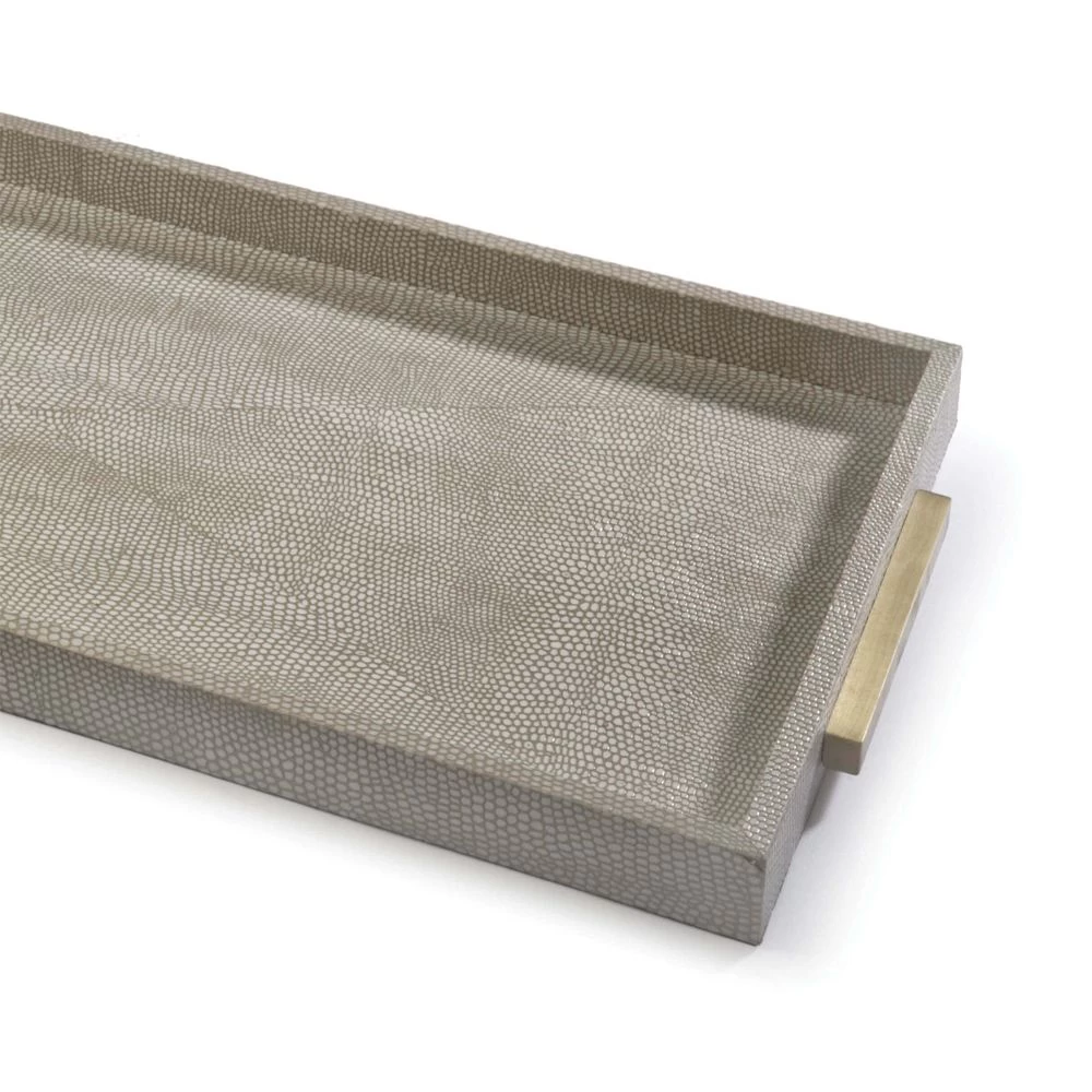 Rectangular faux shagreen tray in Ivory Grey finish with Natural Brass handles.