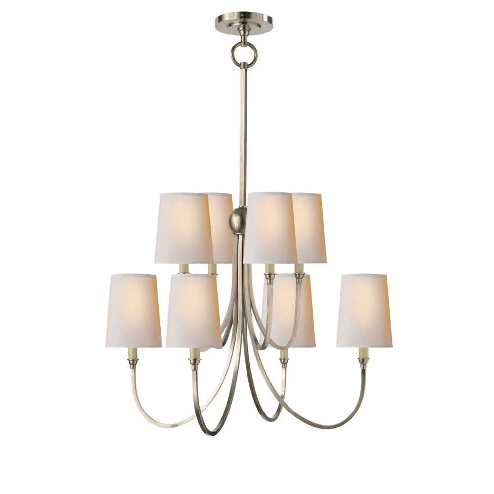 Thomas O’Brien design 8-light metal chandelier in Antique Nickel with Natural Paper Shades. Custom heights available upon request. 5.25 dia. canopy. Also available in Polished Nickel, Antique Brass and Bronze finishes.