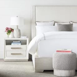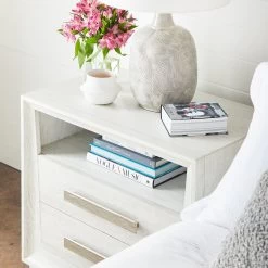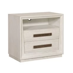 Two drawer nighstand with Open upper shelf in Cascade finish and Ridge silver hardware pull. Available in 3-4 weeks as shown. Also available in other finishes with different lead times.