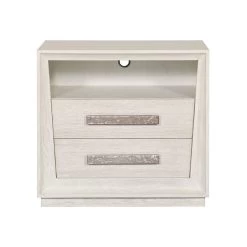 Two drawer nighstand with Open upper shelf in Cascade finish and Ridge silver hardware pull. Available in 3-4 weeks as shown. Also available in other finishes with different lead times.