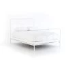 Upholstered queen bed with low headboard and turned metal legs (as shown finish). Platform bed so only requires a mattress.