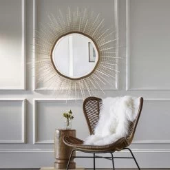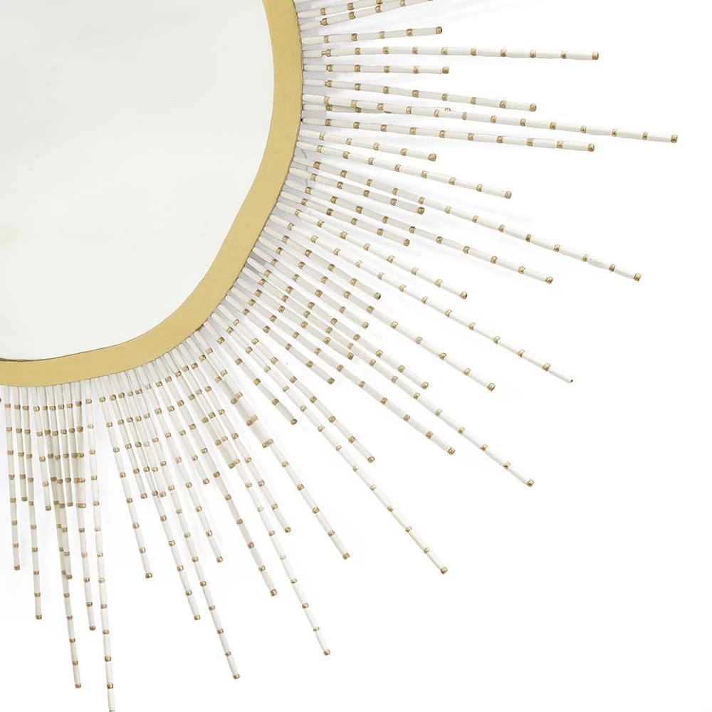 Beveled round mirror with a gold accented metal frame embellished with hand-painted gold coco shell and soft white wood beads.