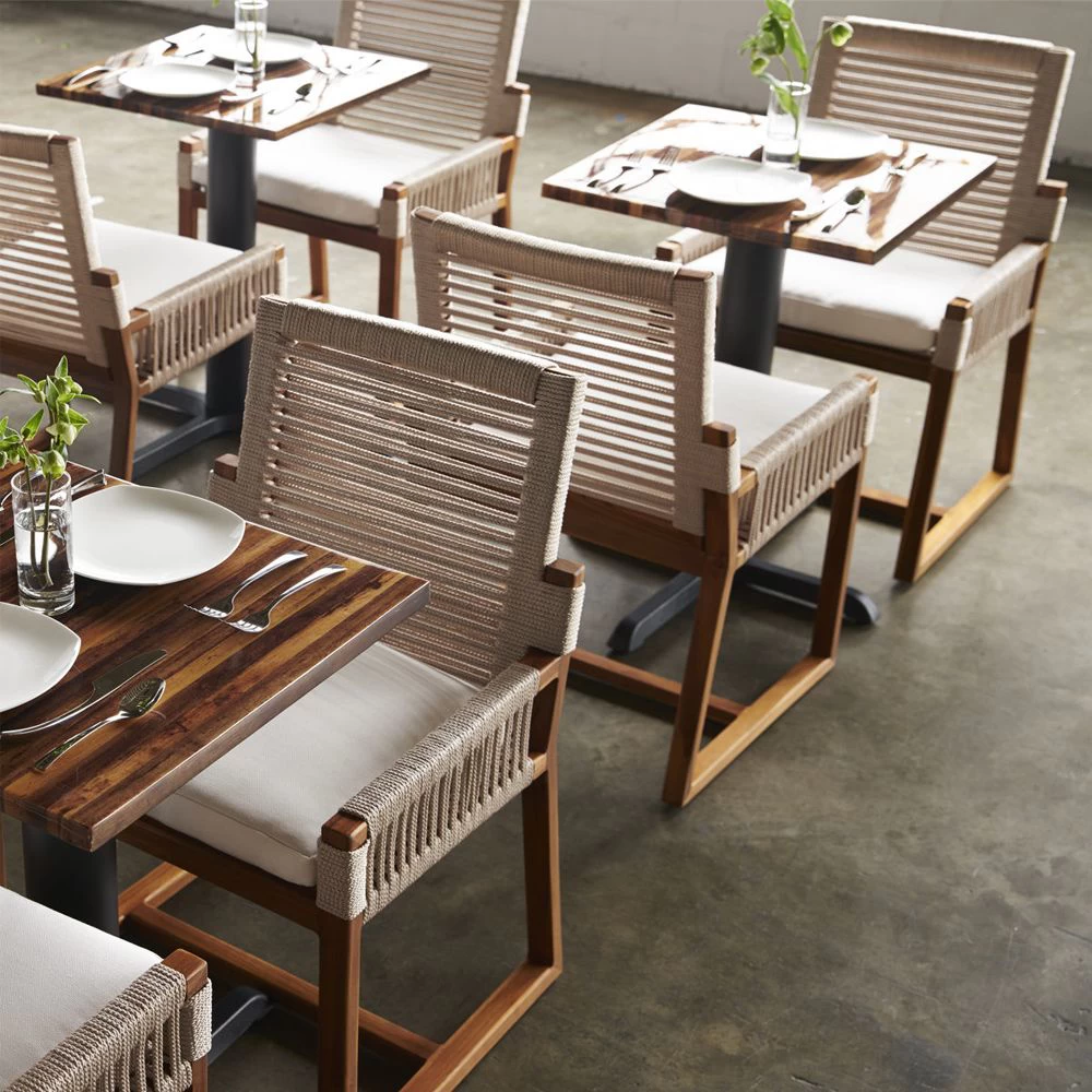 Outdoor dining arm chair in Golden Brown Teak finish with taupe synthetic rope support system and fabric covered seat cushion.